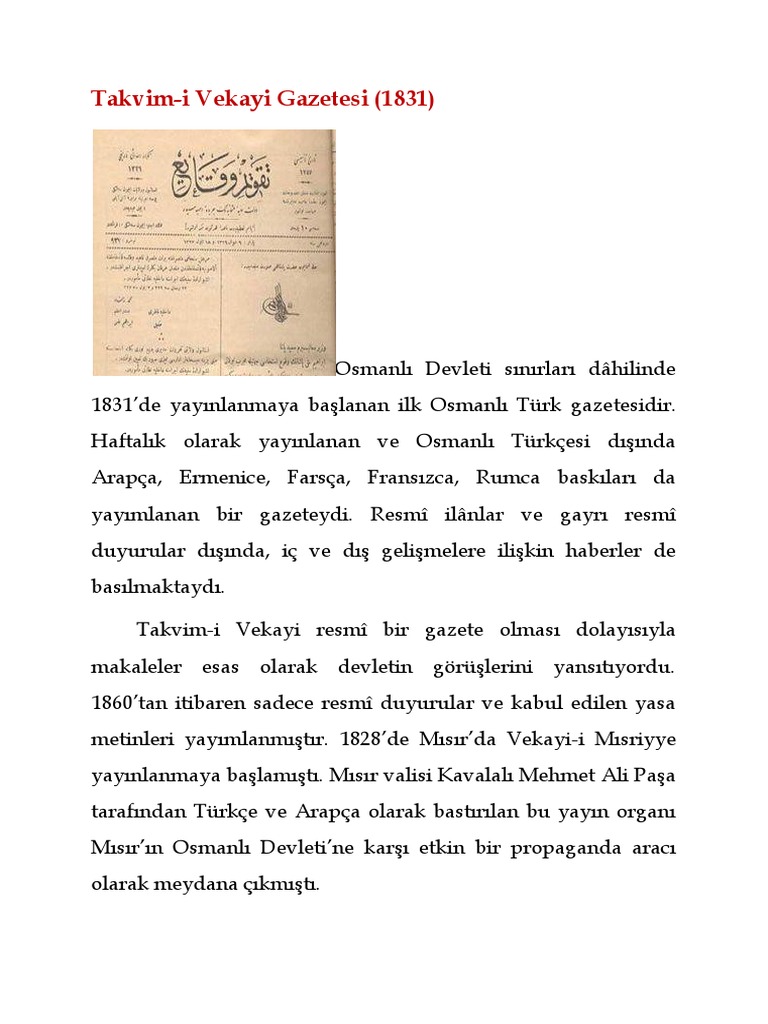 Takvim I Vekayi 1 Kasim 1831 Osmanli Devleti Nin Ilk Resmi Gazetesi Kronolojim
